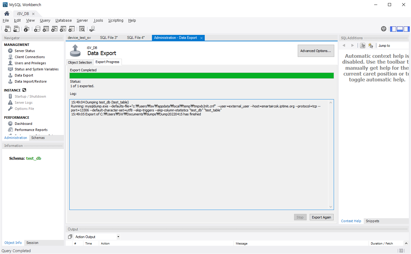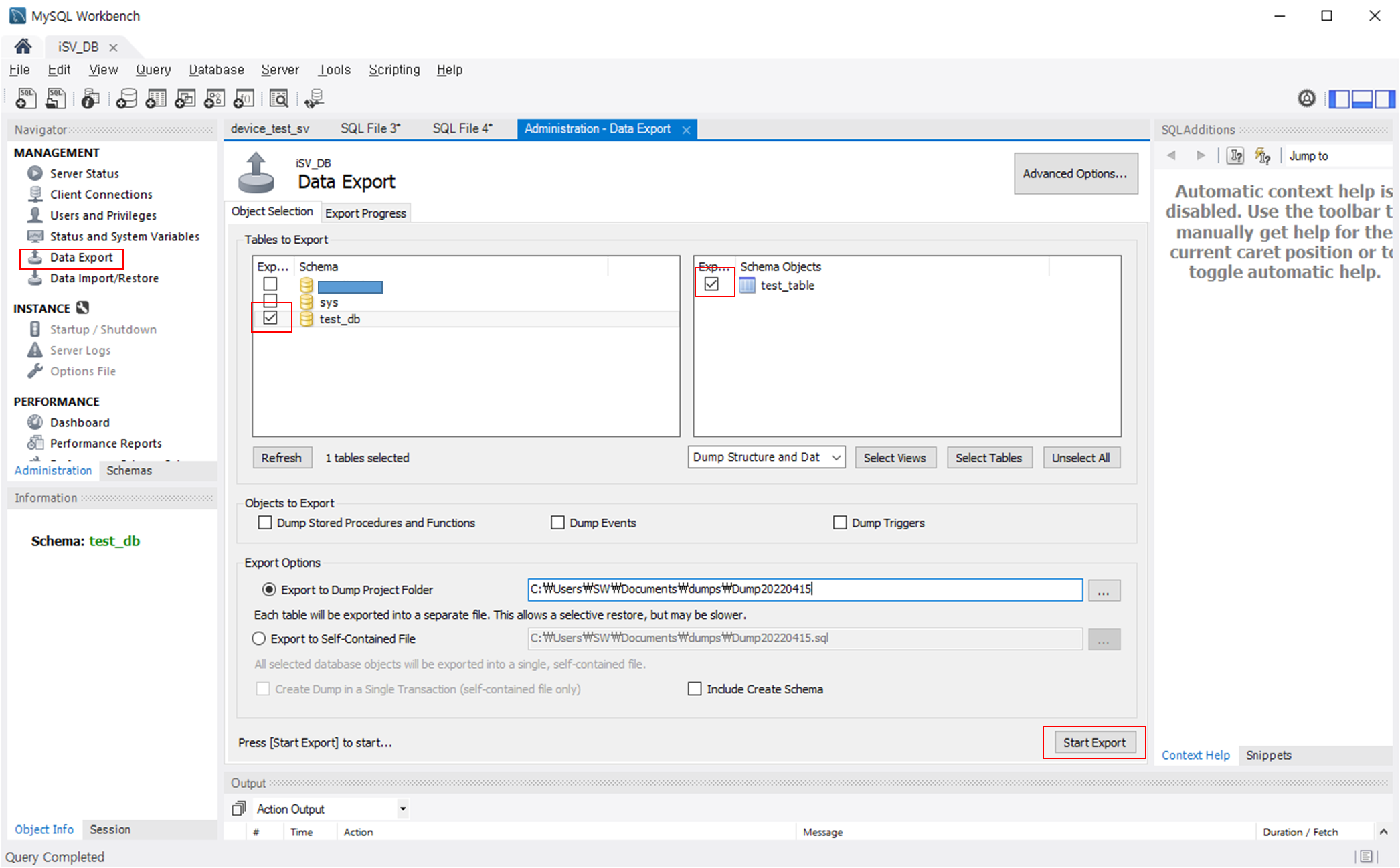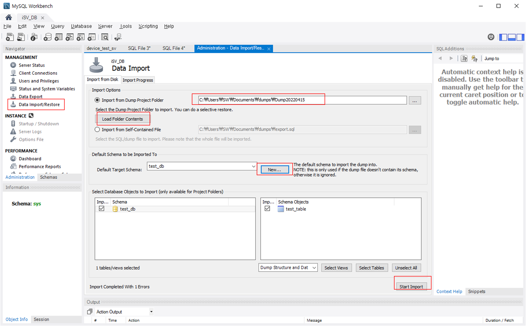 - Data Import - 백업 경로 지정 - Load Folder Contents ( 내용 확인 ) - New...( Schema 지정 ) - Start Import