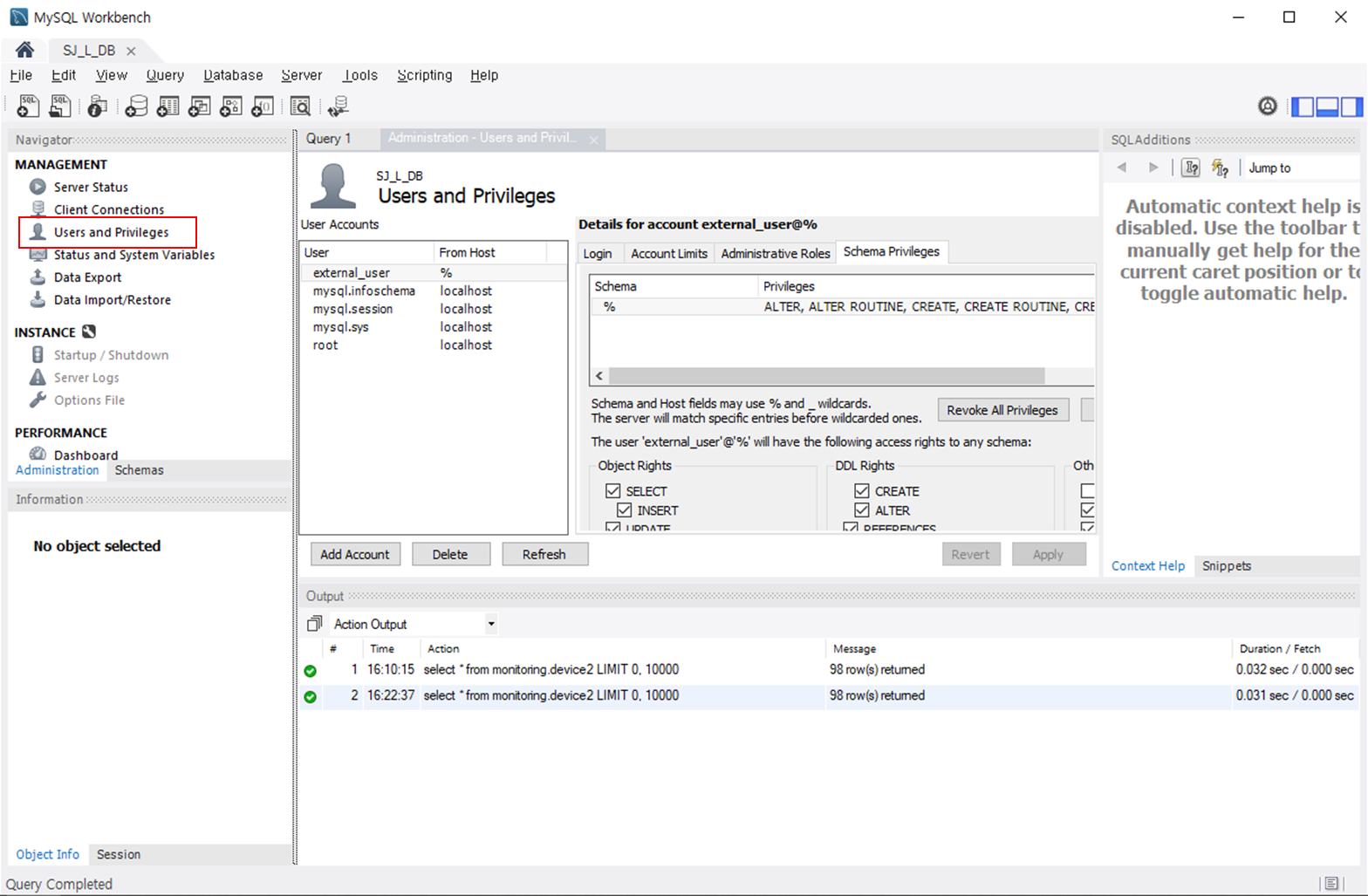 Error executing create database user % sql error 1044 와 같은 error를 만난 경우