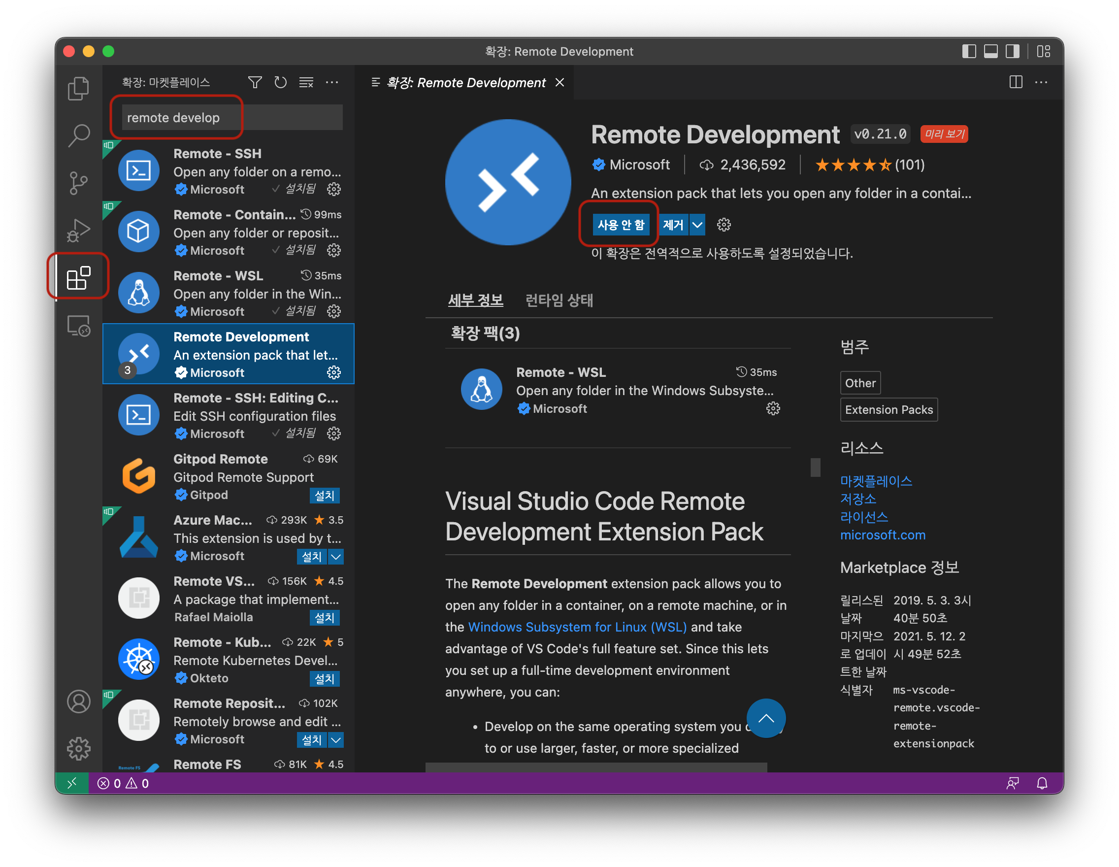 - 아래 이미지는 설치 완료된 시점이라 [사용 안 함] 상태이다.