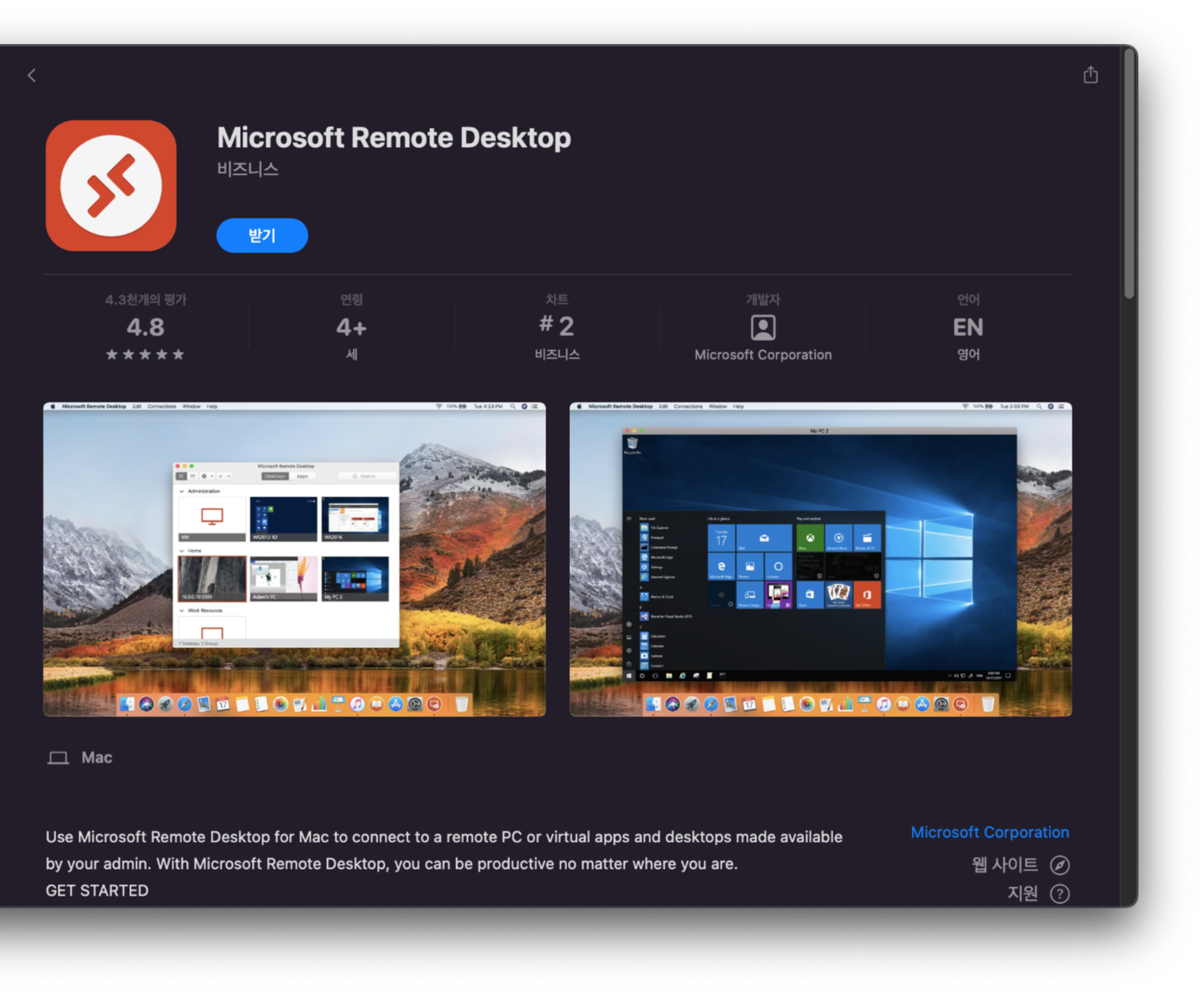 본 포스팅은 맥os에서 윈도우 원격 데스크톱에 연결하는 방법을 소개하며 번외로 윈도우 원격 데스크톱은 공식적으로 pro 이상부터 사용 가능하다.