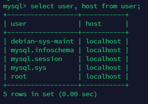 mysql> select user, host from user;