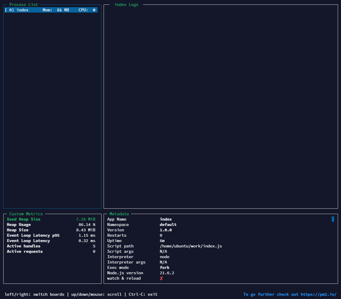 ubuntu@ubuntu:~$ pm2 monit // 모니터링